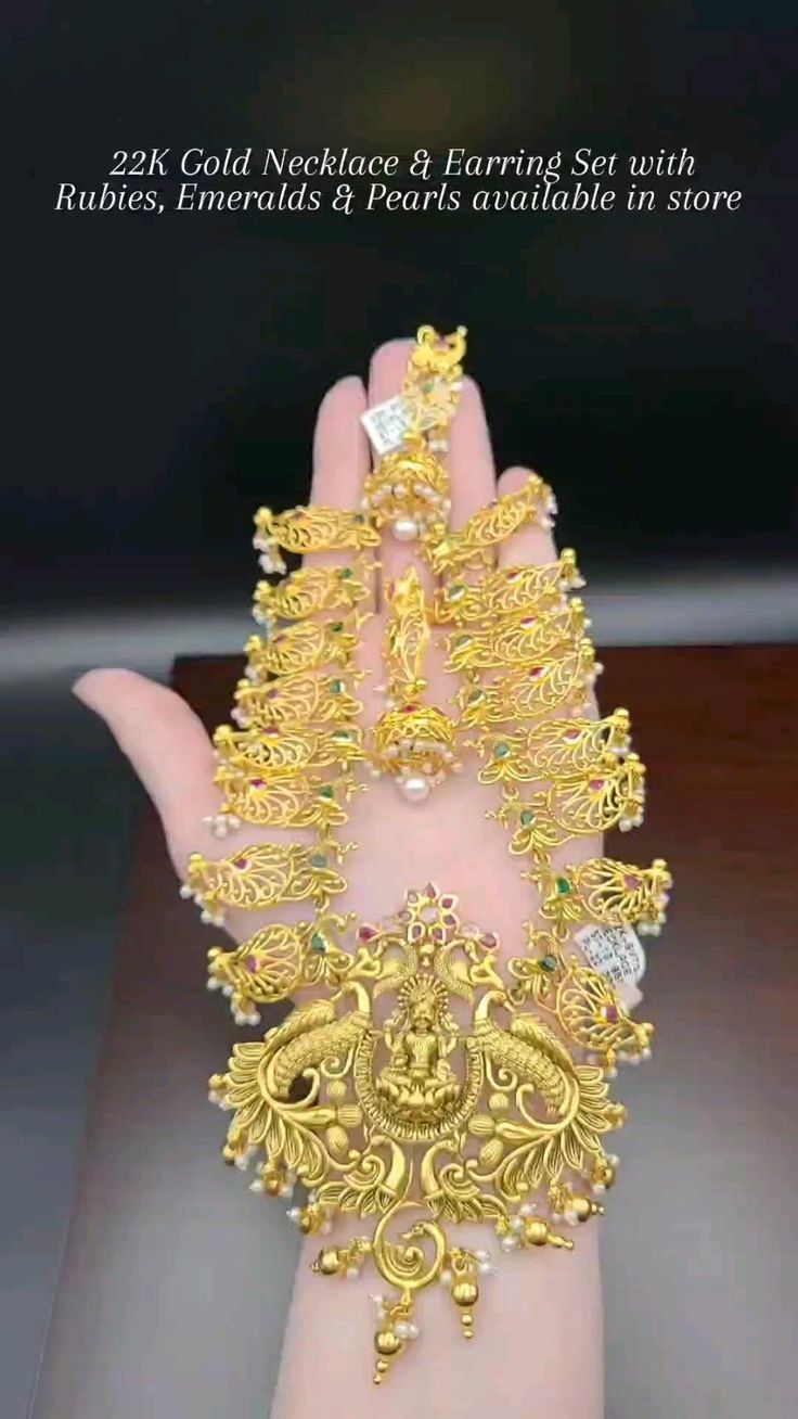 This elegant Gold Necklace and Earring Set is crafted with lustrous pearls and vibrant rubies. The gold setting adds a touch of luxury and sophistication to any outfit. Perfect for special occasions or as a gift for a loved one. Elevate your style with this versatile set.